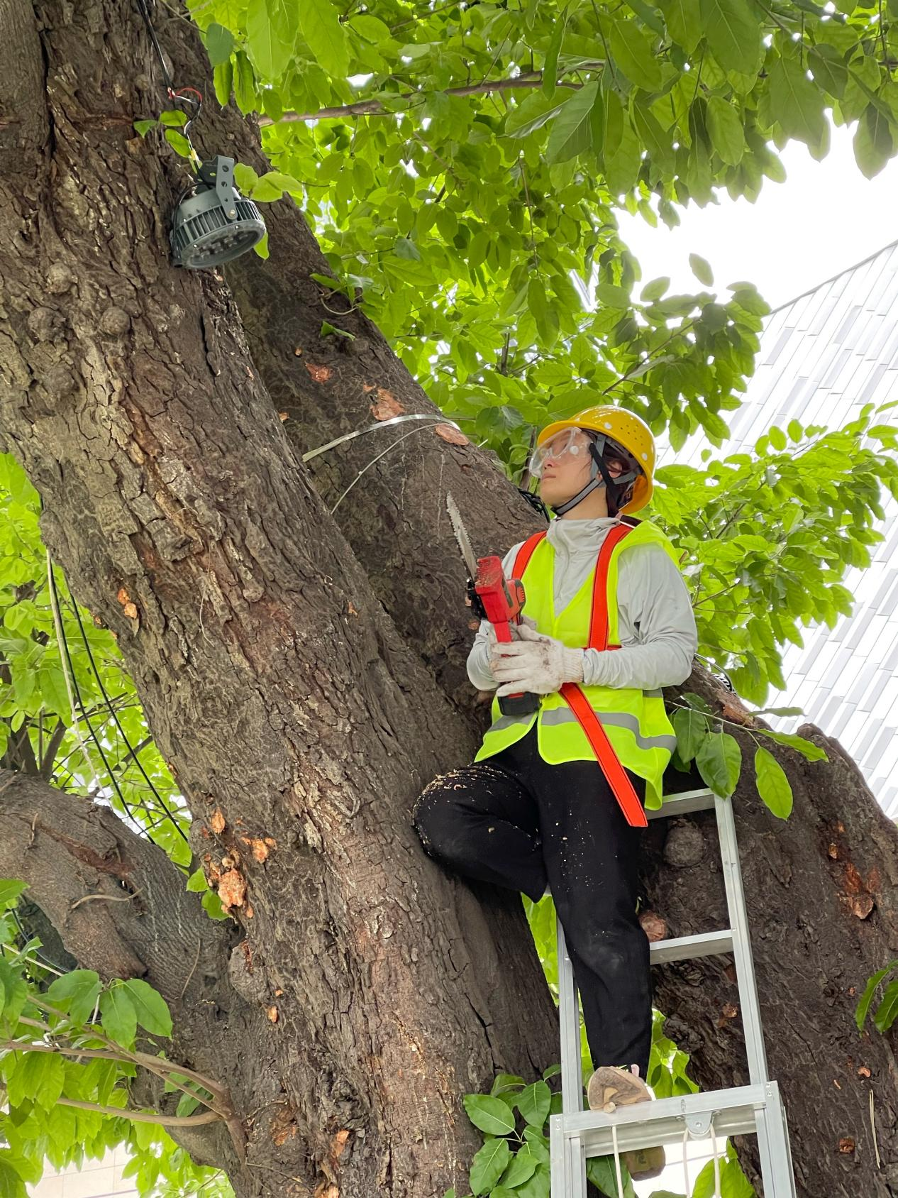周冰颖全副武装防治黄葛树古树树瘤