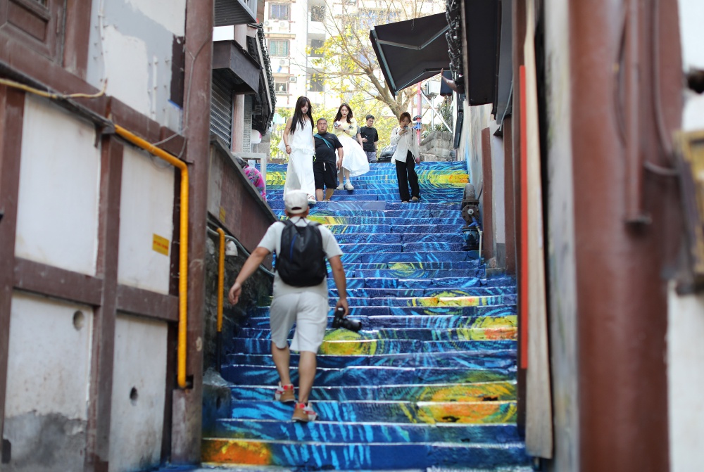 ▲沙坪坝区磁器口古镇,游客打卡梦幻彩绘步道。特约摄影 孙凯芳/视觉重庆