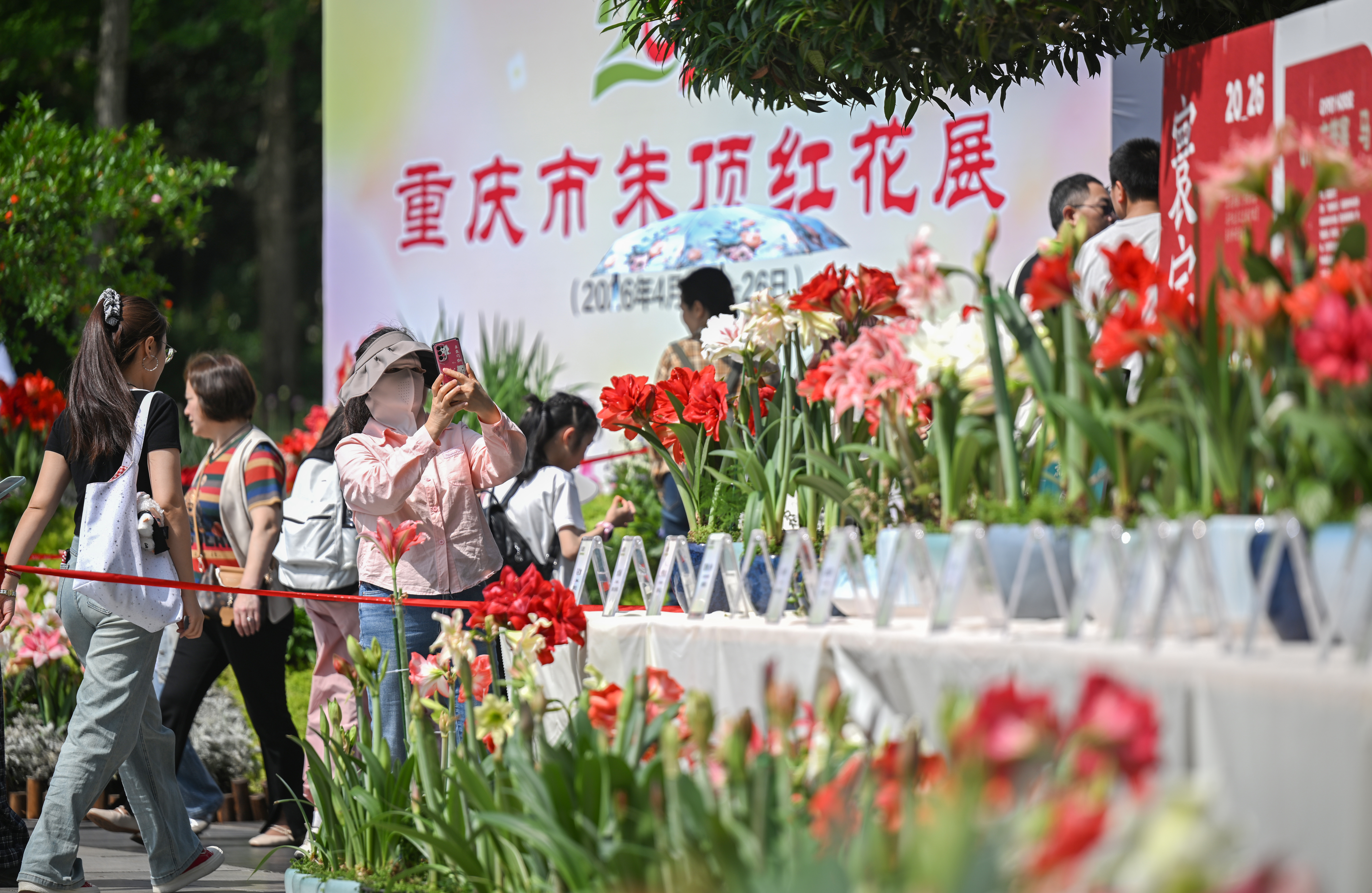 ▲4月17日,重庆动物园,游客正在朱顶红花卉展上拍照打卡。