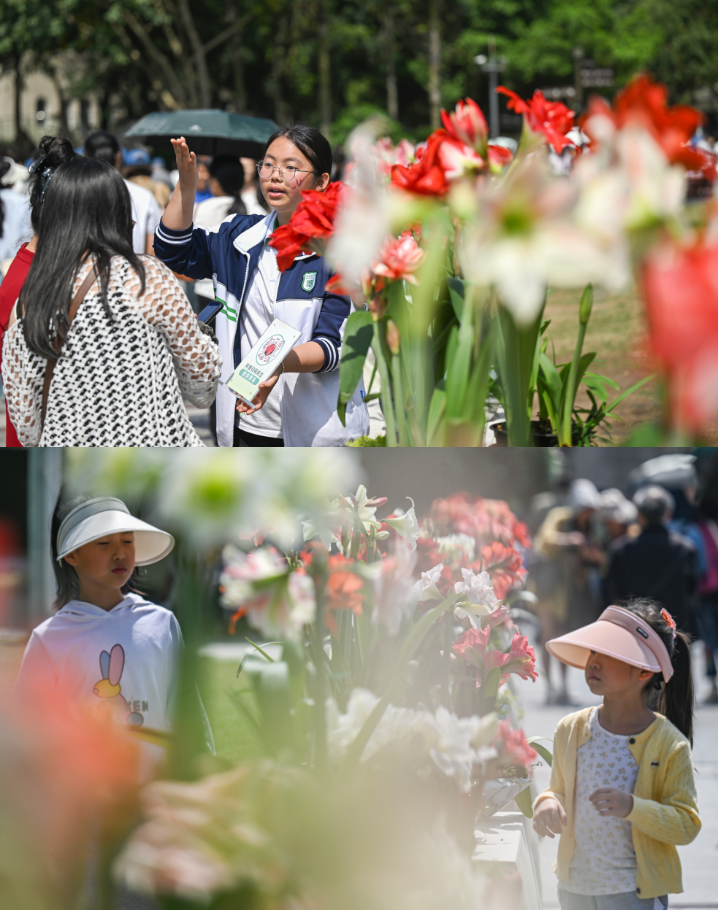 ▲4月17日,重庆动物园,游客正在观赏朱顶红花卉展。