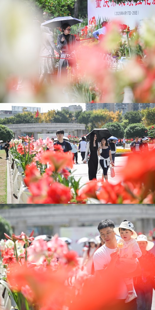 ▲2026年4月17日,重庆动物园,游客正在朱顶红花卉展上拍照打卡。